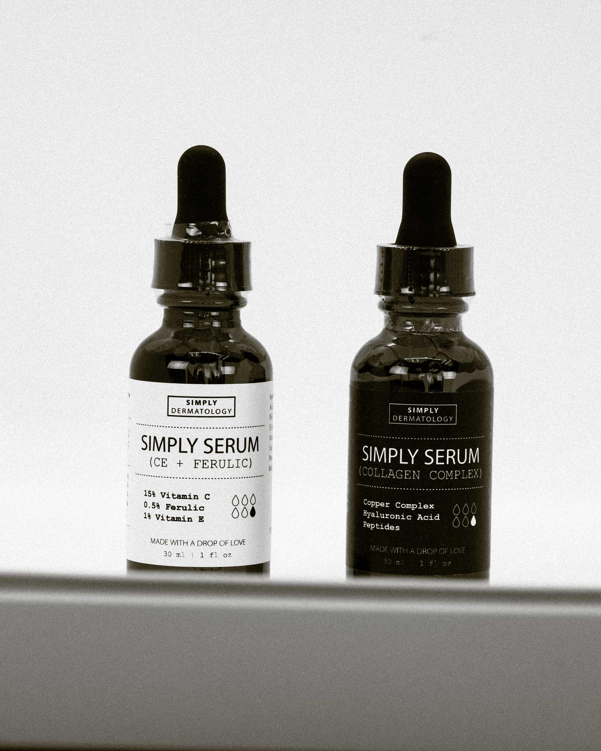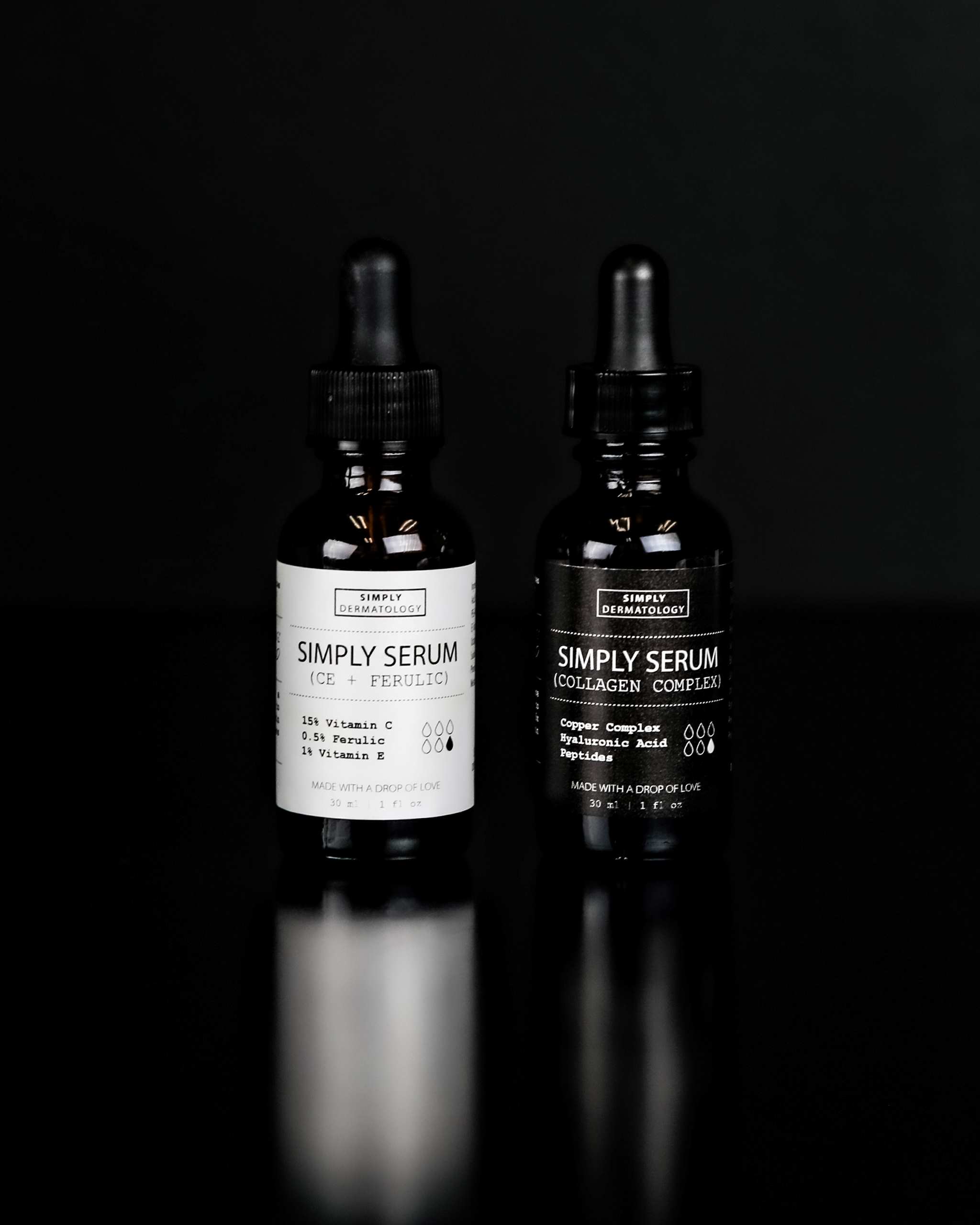 Experience the ultimate in skin transformation with our Dynamic Duo. The Simply Serum® CE + Ferulic brightens and revitalizes with powerful antioxidants, while the Simply Serum® Collagen Complex firms and tightens, promoting youthful resilience. Together, they diminish visible signs of aging and boost radiance. Perfect for daily use, this duo is your secret to a visibly younger-looking complexion.
